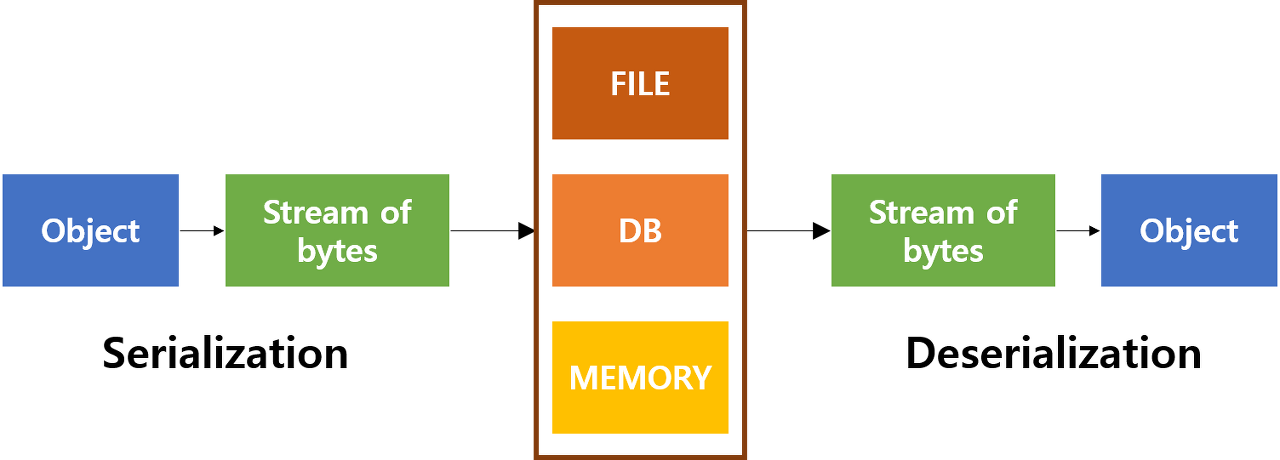 - 역직렬화(Deserialization): 직렬화된 데이터를 원래의 객체나 데이터 구조로 복원하는 과정