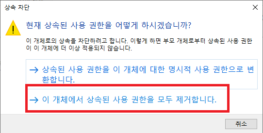 4. 이 개체에서 상속된 사용 권한을 모두 제거합니다. 클릭
