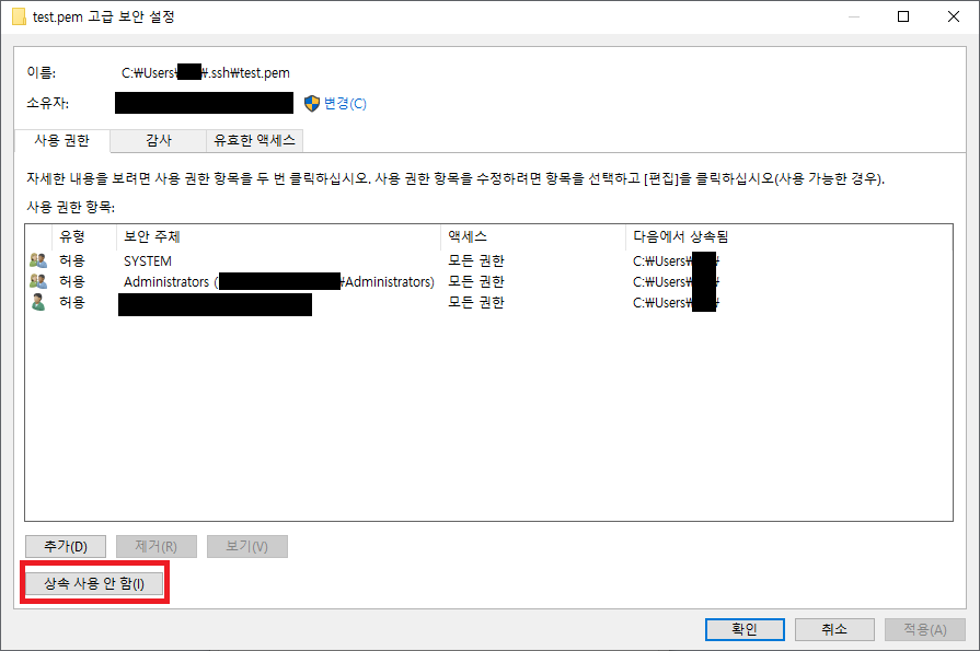 3. 상속 사용 안함 클릭