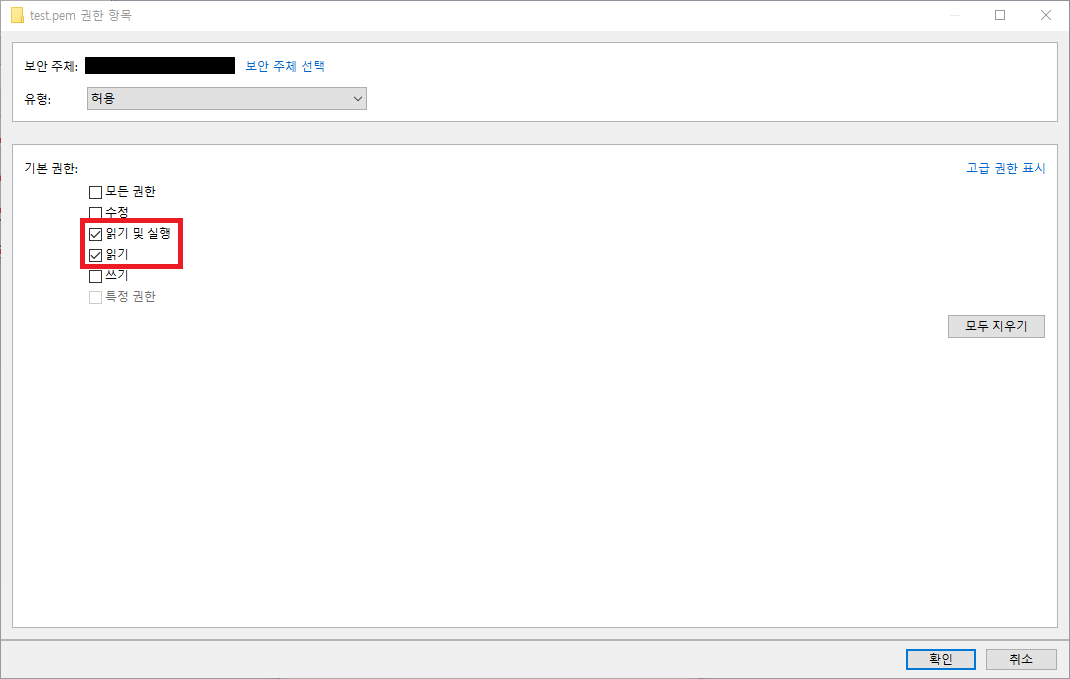 "읽기 및 실행"과 "읽기"만 체크 후 확인