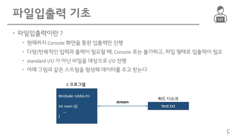 파일입출력은 말 그대로 C언어를 통해 데이터를 주고 받을 때 사용하는 개념이다.