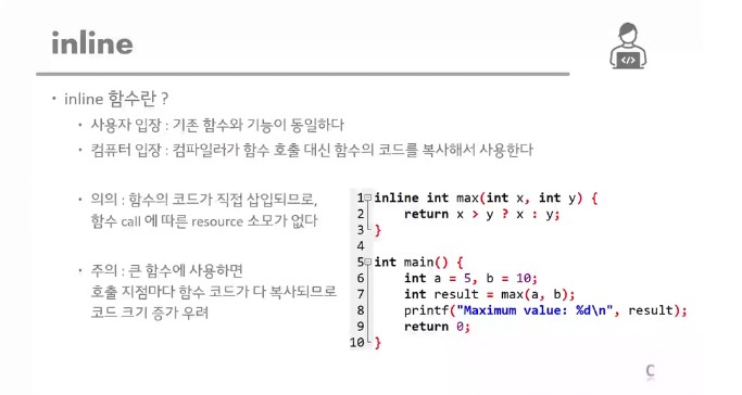 c언어의 인라인 함수란 함수 호출 시 함수 내용이 호출 지점에 직접 삽입되는 특별한 형태의 함수이다.