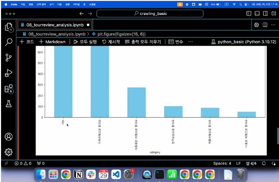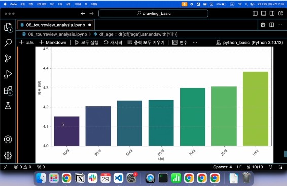 크롤링한 정보는 pandas를 이용하여 csv로 저장하여 그래프로 나타낼 수 있다. 사진에 보이는 정보는 투어사이트에서 가져온 리뷰에 대한 정보이다. 어느 점이 좋은지, 어느 연령대에 인기가 있는지 크롤링을 통해 정보를 가져오면 모두 시각화가 가능하다. 지금 보여주는 그래프는 아직 초기 형태이다. 여기서 여러가지 색상과 x값과 y값을 변환시키면 특정 분석을