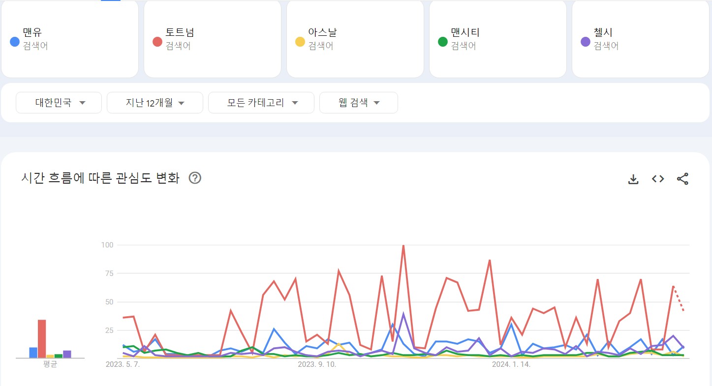 그 중 상위권팀 5팀의 검색량을 2023년 5월부터 2024년 4월까지 확인해보았다.