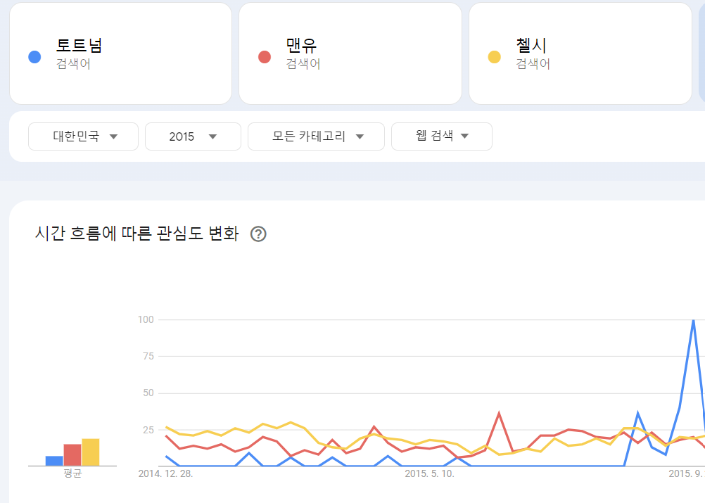 토트넘이 압도적인 언급량을 보이는 것은 한국선수인 손흥민 선수의 인기 때문이다. 실제 손흥민 선수가 이적하기 전엔 인지도가 맨유, 첼시 같은 팀보다 훨씬 떨어졌다. 하지만 손흥민 선수의 이적(2015년 8월) 이후 언급량은 폭발적으로 증가한다.