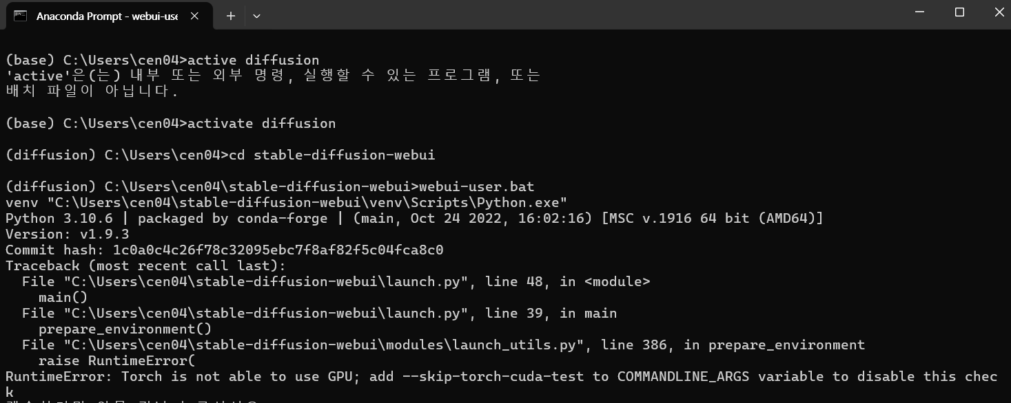 STABLEDIFFUSION을 실행하려고 하는데 다음과 같은 에러가 발생했다. 그래서 실행되지 않는 상태...