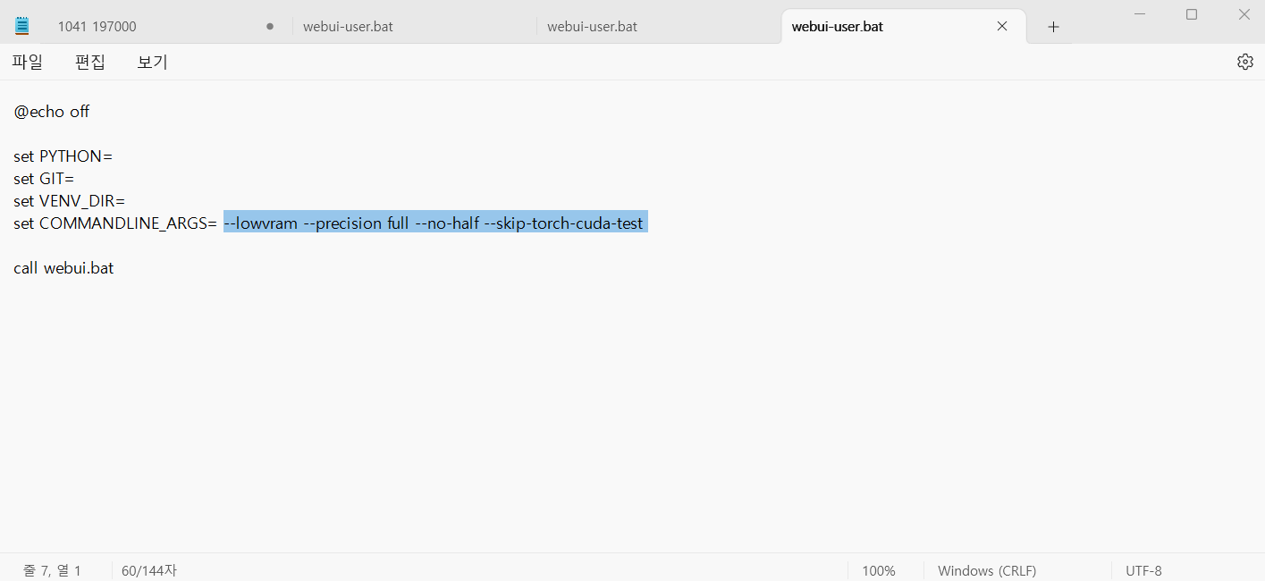 set COMMANDLINE_ARGS= 에 --lowvram --precision full --no-half --skip-torch-cuda-test를 적어준다.