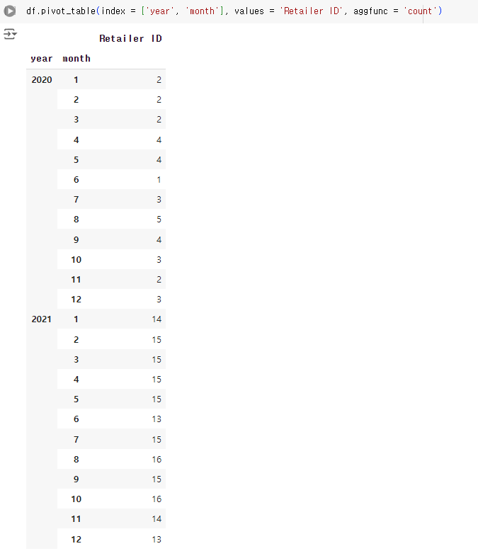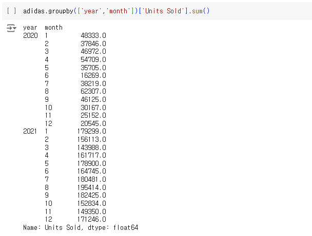 - adidas.groupby(['year', 'month']): adidas 데이터프레임을 year (연도)와 month (월) 칼럼을 기준으로 그룹화