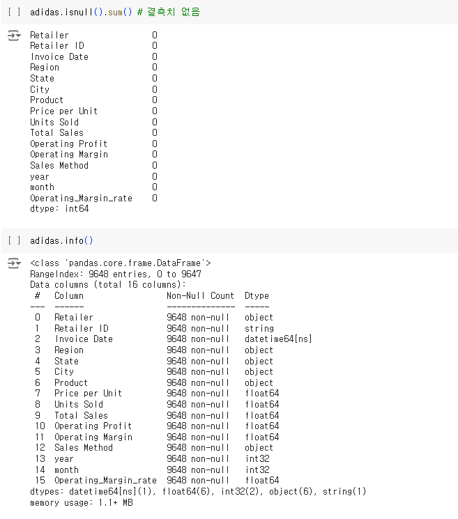 adidas.isnull().sum() 함수를 사용해서 결측값이 있는지 확인한다.