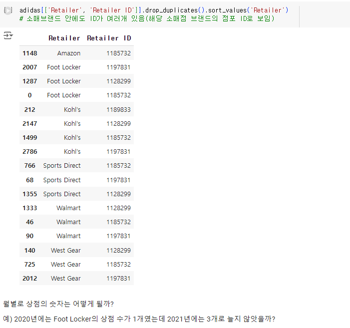 그 이유를 찾아 판매점을 기준으로 피벗테이블을 작성해 보았다. 가장 눈에 띄게 보이는 건 상점 몇 개가 본격적으로 2021년부터 판매를 시작했다는 것이고 Foot Locker도 5배 이상 급증한 것을 보여준다.