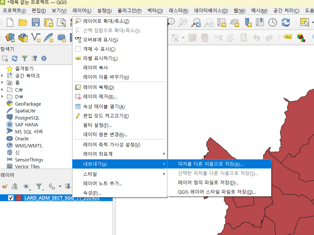 다시 QGIS로 돌아와 실행시켜보자. 실행되면 레이어 - 벡터 레이어 추가로 들어가 shp파일을 로드해준다.