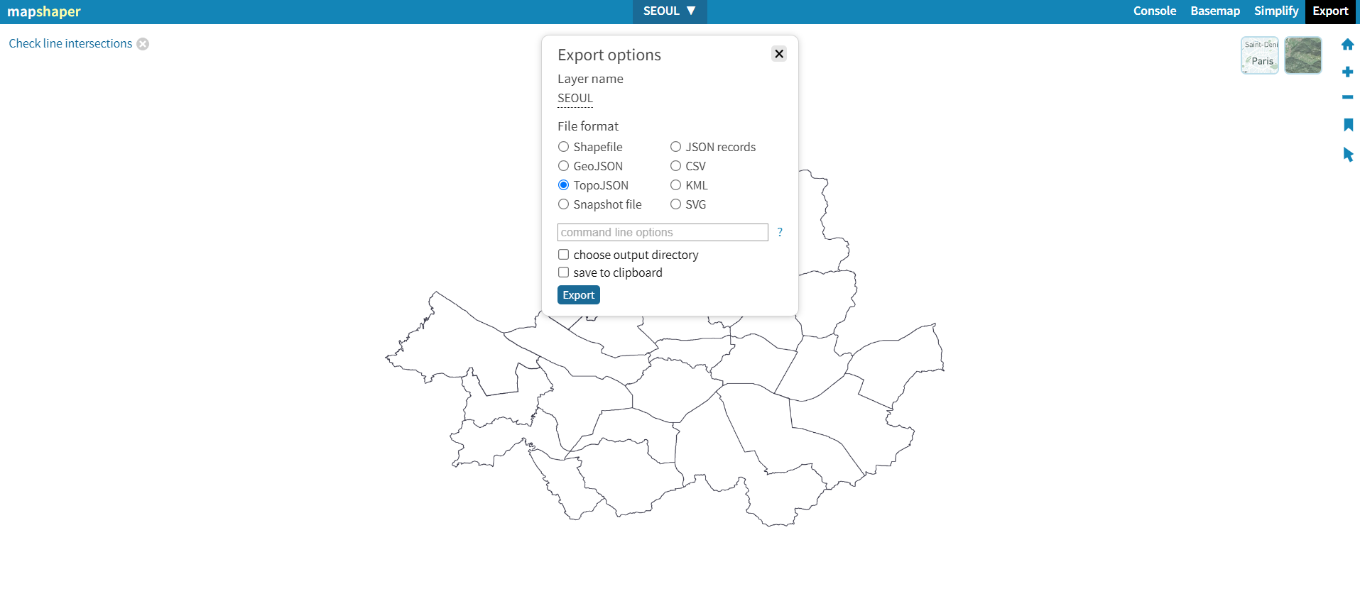 GeoJSON 파일을 업로드하면 어떤 형식으로 변환할 건지 묻는 창이 나온다. 우리는 TopoJSON 으로 변환해야 하니 고르고 Export버튼을 누르면 변환이 시작된다.