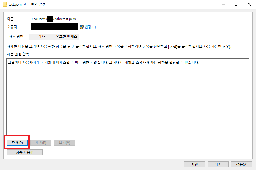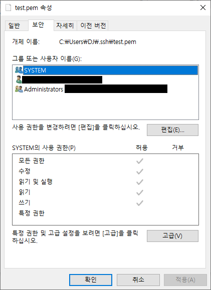 windows에서 AWS key permission을 변경하는 방법을 찾아보고 해결하려 다음과 같이 시도했다.