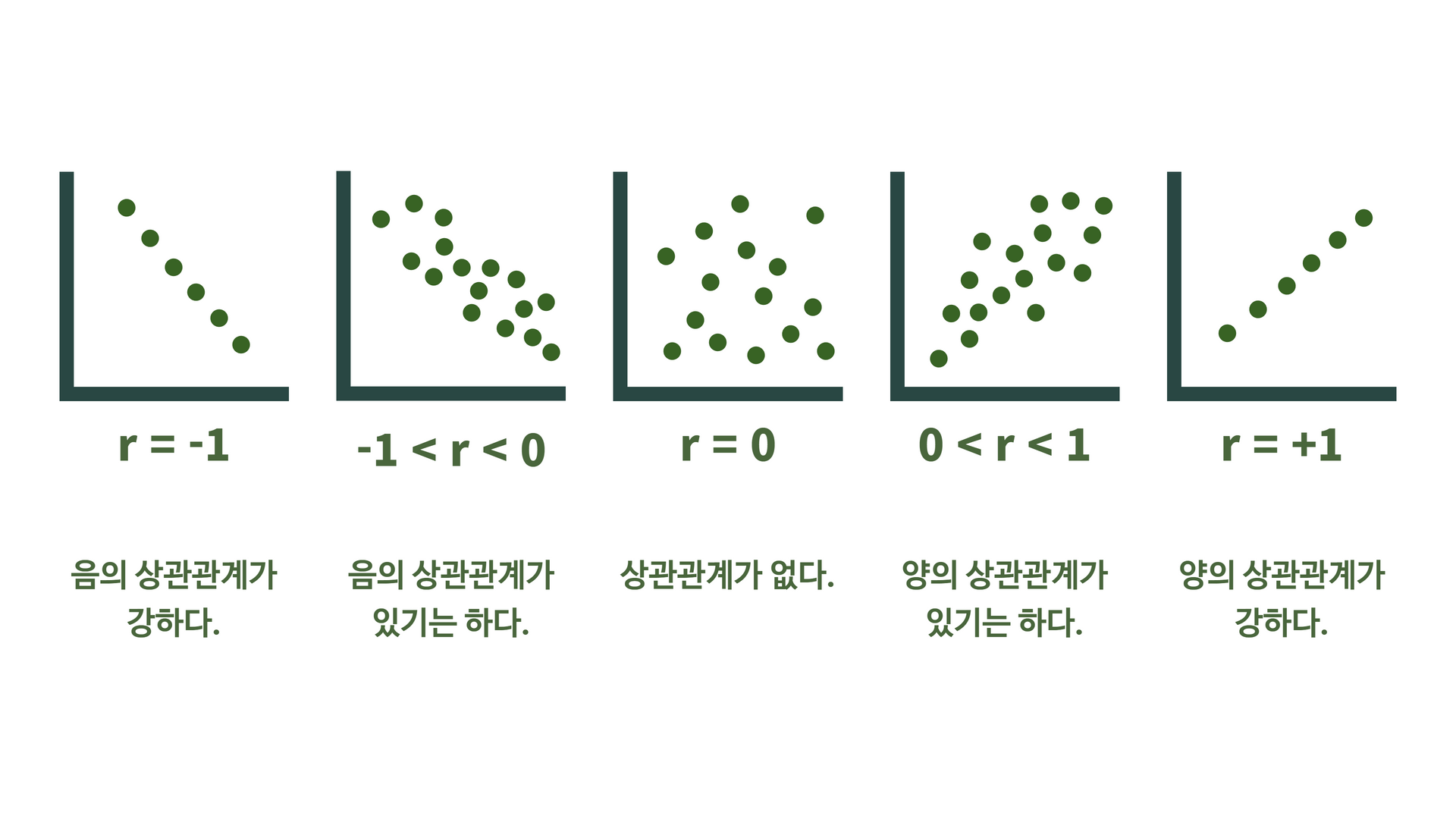 이 값은 -1에서 1 사이의 값을 가지며 1은 완벽한 양의 선형 관계를 -1은 완벽한 음의 선형 관계를 0은 선형 관계의 부재를 의미한다.