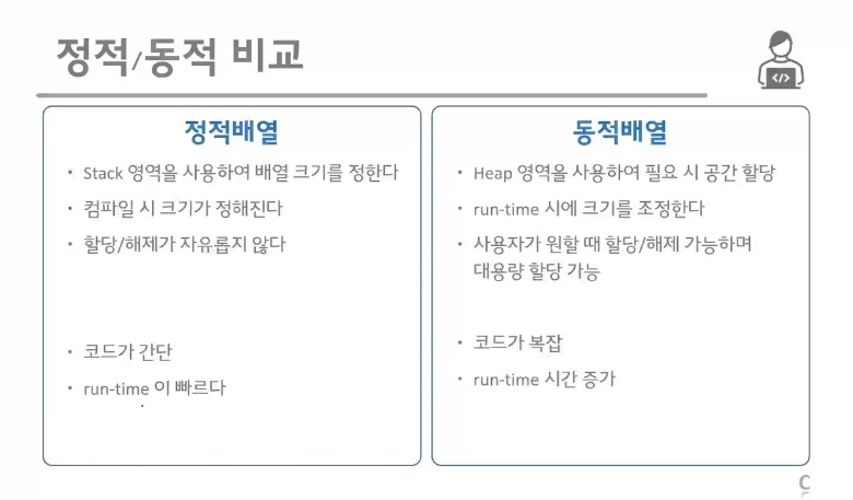 반면, 동적 배열은 프로그램 실행 중에 메모리 할당 및 해제를 통해 배열의 크기를 조정할 수 있다.