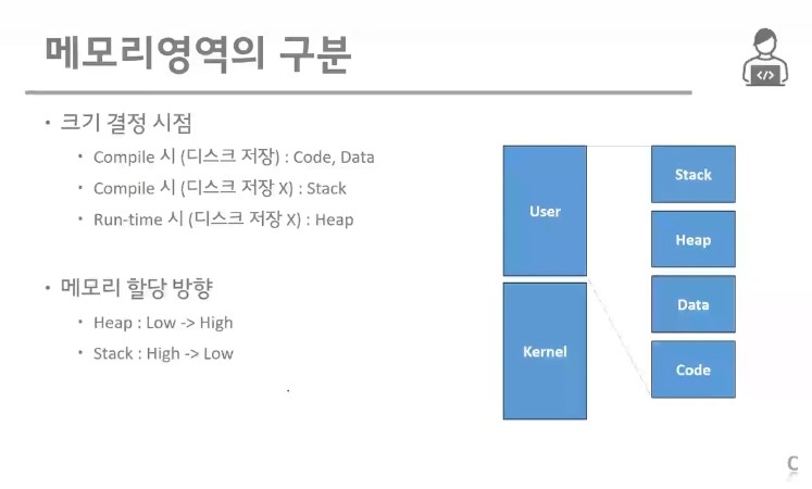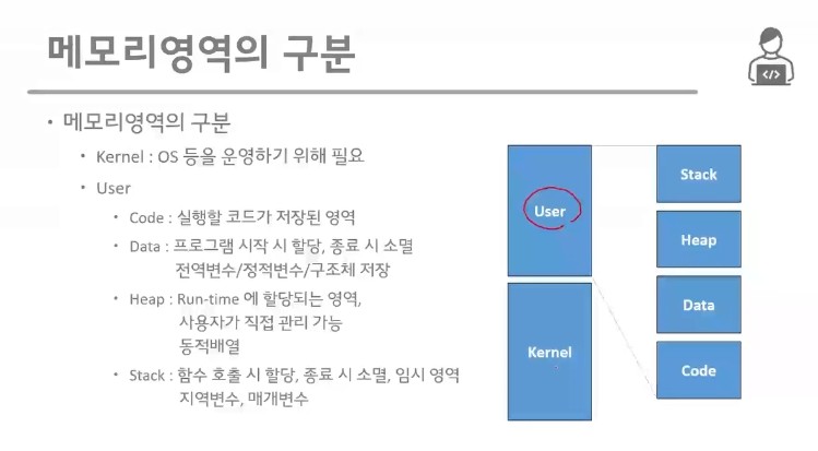 C언어의 메모리영역은 크게 Kernel 부분과 User 부분으로 나뉜다. 우리가 지금 집중해야 되는건 User