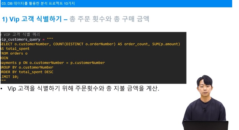 vip고객을 식별하기 위한 코드작성으로 미리 sql으로 쿼리작업을 끝냈기때문에 굉장히 명료하게 작성할 수 있다.