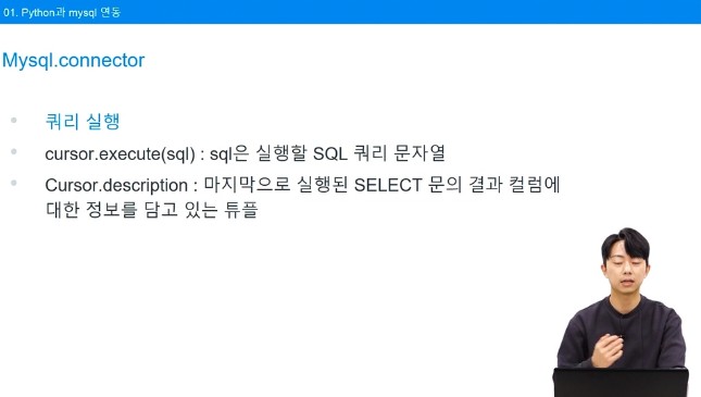 cursor.execute(): 이 메서드는 SQL 쿼리를 실행하는 데 사용, 변수안에 실행하려는 SQL 명령문을 문자열 형태로 기입