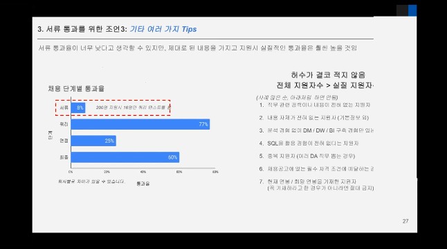 여기서 중요한건 말 그대로 1차 서류가 가장 빡세기 때문에 서류만 통과한다면 분석가로 취업할 확률이 급상승한다는 것