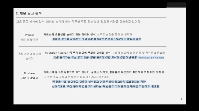 채용 공고 분석에 앞서, 데이터 분석가 세부 직무별 주로 하는 일과 필요한 역량을 이해하고 있어야 한다.