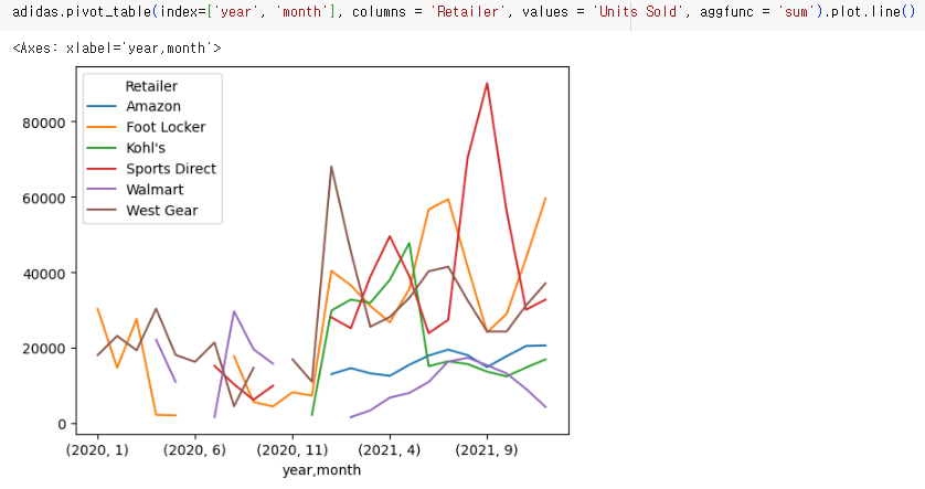 adidas 데이터프레임에서 연도(year)와 월(month)별로 Units Sold (판매된 단위)의 합계를 계산하고 이를 선 그래프로 시각화하는 과정이다. 구체적으로 보면