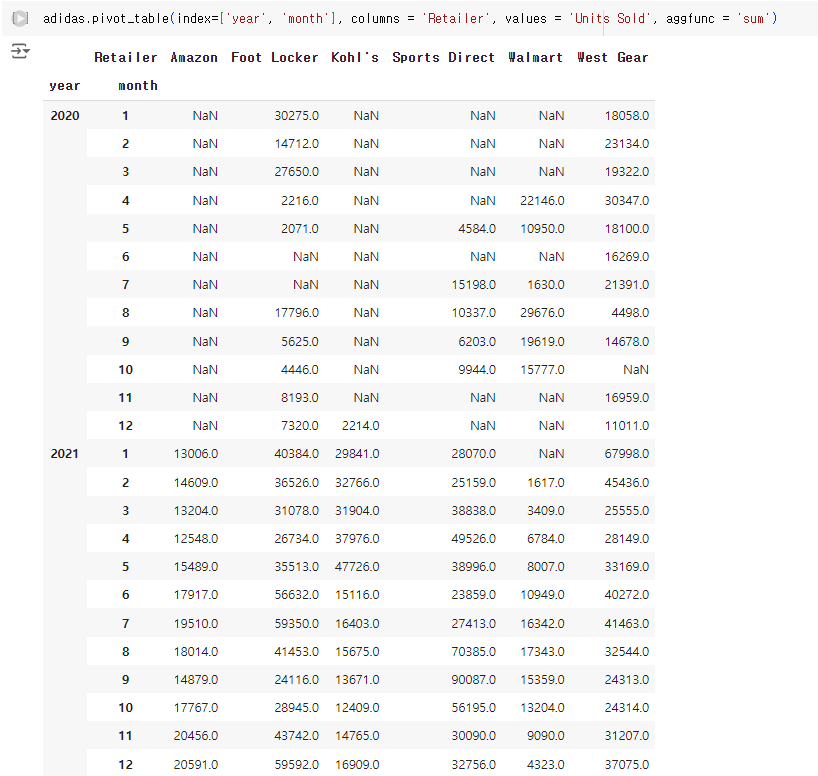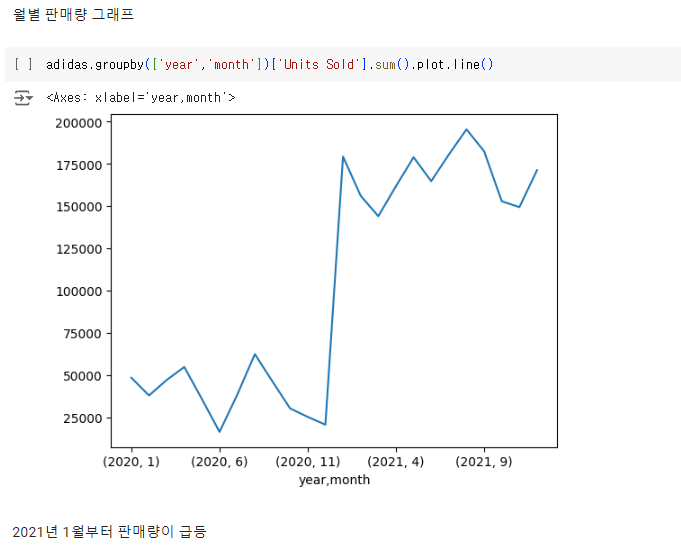 - adidas.groupby(['year', 'month']): adidas 데이터프레임을 year (연도)와 month (월) 칼럼을 기준으로 그룹화