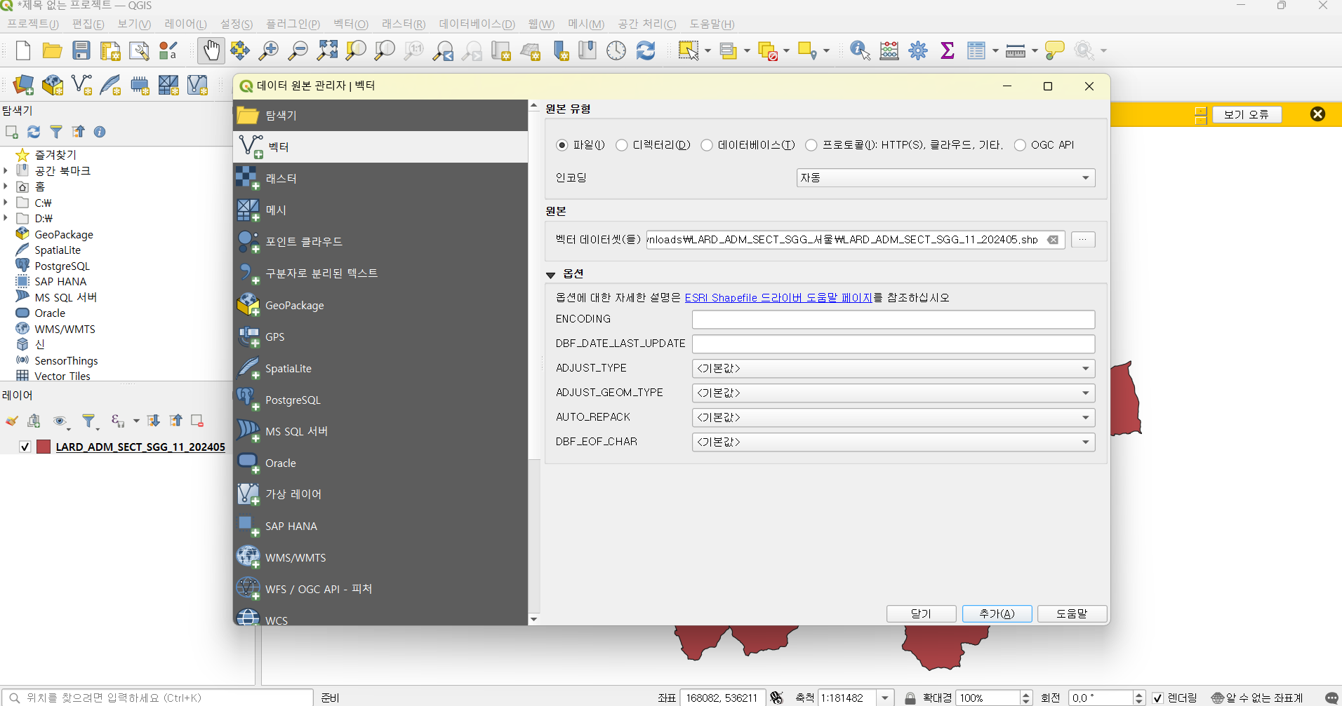 다시 QGIS로 돌아와 실행시켜보자. 실행되면 레이어 - 벡터 레이어 추가로 들어가 shp파일을 로드해준다.