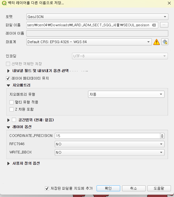 여기서 포맷, 파일이름, 좌표계를 유의해서 설정해야한다.